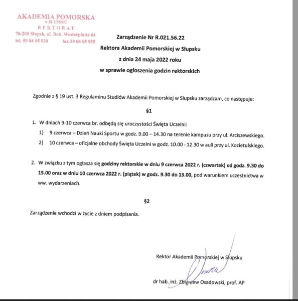 28 maja 2022, 22:25Godziny rektorskieW dniach 9-10 VI 2022 roku JM Rektor Akademii Pomorskiej w Słupsku ogłosił godziny rektorskie. Treść zarządzenia: