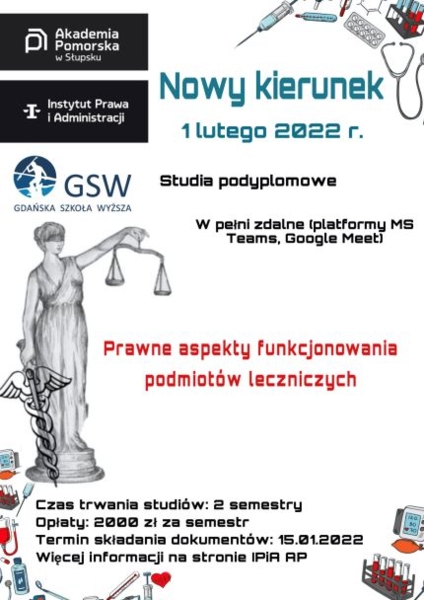 Informujemy, że od 1 lutego 2022 roku w naszym Instytucie ruszają nowe studia podyplomowe: "Prawne aspekty funkcjonowania podmiotów leczniczych".